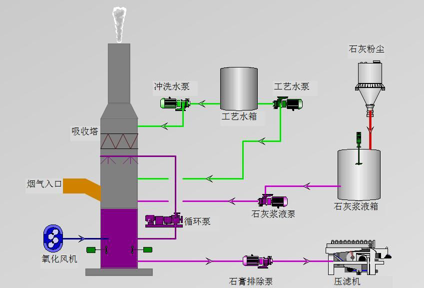 循環(huán)漿液通過(guò)漿液循環(huán)泵向上輸送到噴淋層中,通過(guò)噴嘴進(jìn)行霧化,噴射到吸收塔中,以便脫除SO2、SO3、HCL和HF,與此同時(shí)在“強(qiáng)制氧化工藝”的下處理下反應(yīng)的副產(chǎn)物被導(dǎo)入的空氣氧化為石膏漿液,這部分石膏漿液通過(guò)石膏漿液泵排出,進(jìn)入石膏脫水系統(tǒng),通過(guò)處理,生成石膏。同時(shí)石灰漿液泵根據(jù)脫硫塔內(nèi)脫硫漿液的PH值,定期向吸收塔內(nèi)補(bǔ)充新的石灰漿液。經(jīng)過(guò)凈化處理的煙氣流經(jīng)兩級(jí)除霧器除霧,在此處將清潔煙氣中所攜帶的漿液霧滴去除,最后潔凈的煙氣通過(guò)類(lèi)煙囪排向大氣。