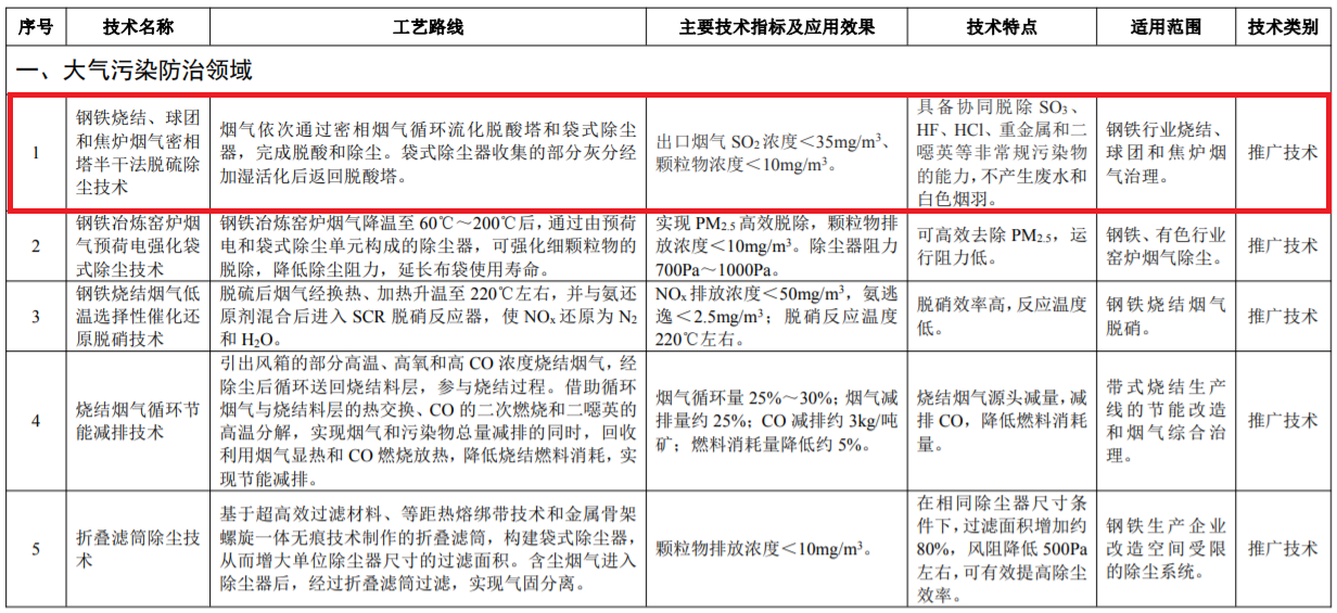 1125日,生態(tài)環(huán)境部發(fā)布關(guān)于2021年《國家先進(jìn)污染防治技術(shù)目錄(大氣污染防治、噪聲與振動控制領(lǐng)域)》(公示稿)的公示,共涉及22項大氣污染防治領(lǐng)域技術(shù),6項噪聲與振動控制領(lǐng)域技術(shù)。其中,由北京北科環(huán)境工程有限公司(以下簡稱:北科環(huán)境)擁有知識產(chǎn)權(quán)的“鋼鐵燒結(jié)、球團(tuán)和焦?fàn)t煙氣密相干塔半干法脫硫除塵技術(shù)”位列榜單之首。在國家環(huán)保技術(shù)創(chuàng)新層面,北科環(huán)境再獲廣泛肯定與充分認(rèn)可。