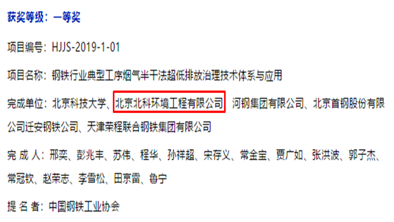 為充分發(fā)揮科技獎(jiǎng)勵(lì)對(duì)環(huán)保產(chǎn)業(yè)技術(shù)進(jìn)步的促進(jìn)作用,建立以企業(yè)為主體、市場(chǎng)為導(dǎo)向、產(chǎn)學(xué)研用相結(jié)合的環(huán)保產(chǎn)業(yè)技術(shù)創(chuàng)新體系,鼓勵(lì)我國(guó)環(huán)境技術(shù)原始創(chuàng)新、集成創(chuàng)新,促進(jìn)環(huán)保產(chǎn)業(yè)高質(zhì)量發(fā)展,支撐生態(tài)環(huán)境治理,加快改善環(huán)境質(zhì)量,2019年12月20日,中國(guó)環(huán)境保護(hù)產(chǎn)業(yè)協(xié)會(huì)根據(jù)《環(huán)境技術(shù)進(jìn)步獎(jiǎng)獎(jiǎng)勵(lì)辦法(試行)》的規(guī)定,經(jīng)過(guò)專(zhuān)家輔導(dǎo)、單位提名,評(píng)審委員會(huì)評(píng)審、現(xiàn)場(chǎng)答辯、獎(jiǎng)勵(lì)委員會(huì)審定和公示,由北京北科環(huán)境工程有限公司、北京科技大學(xué)、河鋼集團(tuán)、北京首鋼股份有限公司、北京首鋼國(guó)際工程技術(shù)有限公司、天津榮程聯(lián)合鋼鐵集團(tuán)有限公司聯(lián)合完成的科技成果“半干法煙氣超低排放與多功能耦合關(guān)鍵技術(shù)及其在鋼鐵行業(yè)的應(yīng)用”項(xiàng)目,榮獲 “鋼鐵行業(yè)典型工序煙氣半干法超低排放治理技術(shù)體系與應(yīng)用” 2019年度環(huán)境技術(shù)進(jìn)步獎(jiǎng)一等獎(jiǎng)。