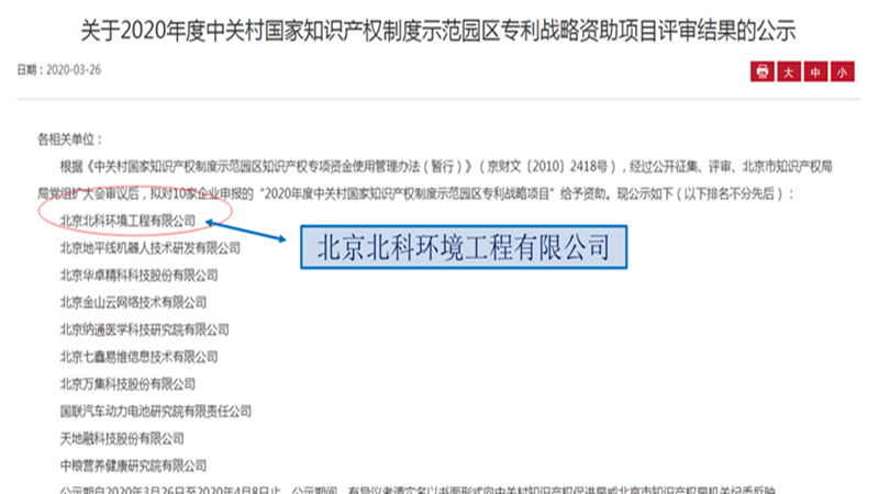 2020年3月26日,中關(guān)村知識(shí)產(chǎn)權(quán)促進(jìn)局對(duì)“2020年度中關(guān)村國(guó)家知識(shí)產(chǎn)權(quán)制度示范園區(qū)專利戰(zhàn)略資助項(xiàng)目”的評(píng)審結(jié)果進(jìn)行了公示,北京北科環(huán)境工程有限公司(以下簡(jiǎn)稱:北科環(huán)境)位列榜首。